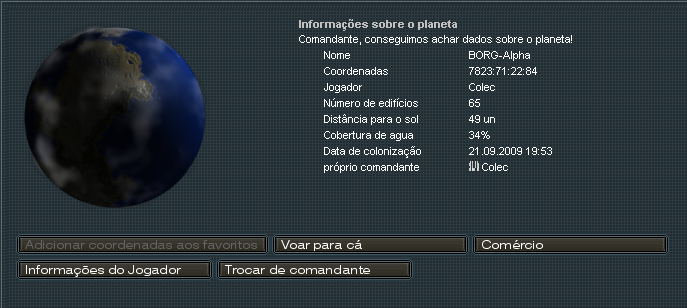 Em um planeta habitado, você encontrara já algumas informações técnicas sobre o mesmo, assim como verificar se há algo no comercio (importar/exportar), dar ordem de vôo, ou adicionar aos favoritos, assim como ver mais informações sobre o jogador dono daquele planeta.